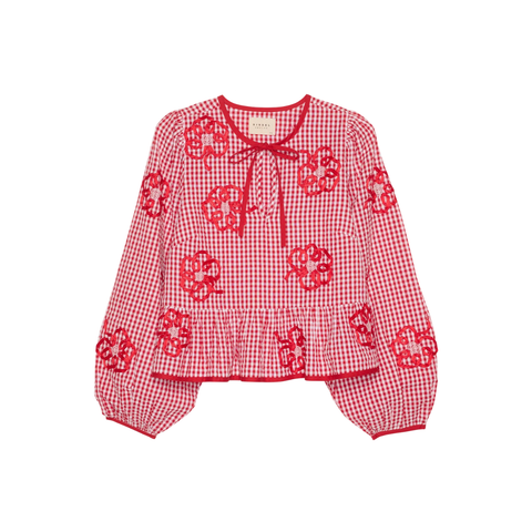 Sunny Top er lavet i restfarvet seersucker med en feminin pasform. Den har V-udskæring med bindebånd foran og brede ballonærmer med faste manchetter i kontrastfarven rød. Toppen har en peplumskæring, der skaber en smuk silhuet, og er dekoreret med fine blomsterapplikationer i satinbånd med glasperler i midten.