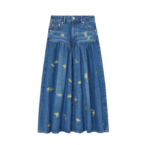 Lang denimnederdel med små gule blomsterprint, der giver et feminint og sommerligt udtryk. Designet med lav talje samt knap- og lynlåslukning for en klassisk pasform. Nederdelen har flere praktiske lommer, og det påsyede skørt med rynkesyninger skaber et flot, let og levende fald – perfekt til et afslappet og stilfuldt look.
