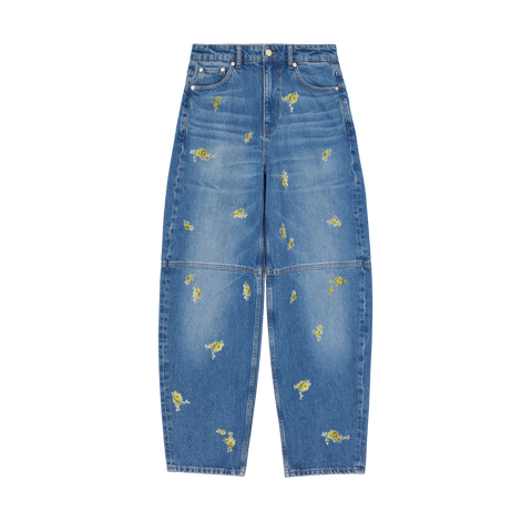 Disse blå jeans med gule blomsterprint kombinerer klassisk denim med et feminint og legende udtryk. De små gule blomster giver et unikt look, mens den let ballonformede pasform og de brede ben skaber en moderne og afslappet silhuet.