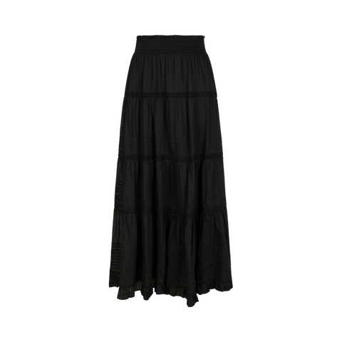 Smuk maxi-nederdel i 100% blød og luftig bomuld med romantiske blondedetaljer og niveauer samt smocksyninger i taljen. Nederdelen er sammensat af fire paneler, hvilket giver ekstra vidde og lethed. Den har desuden et diskret underskørt i samme tekstil og farve.