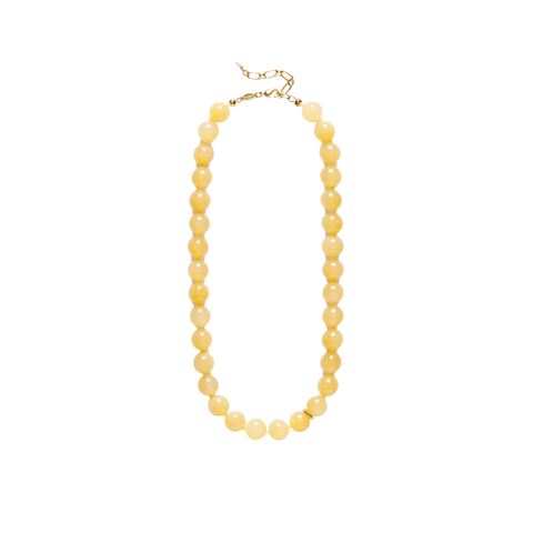 Halskæden er fremstillet i messing med 18 karat guldbelægning og e-coating, som beskytter mod anløbning. Den er detaljeret med glasperler og 10 mm jade, hvilket tilfører både farve og karakter. Kæden kan justeres fra 39,5 til 44 cm og afsluttes med en hummerlås samt en fin detalje i form af en dyrket ferskvandsperle.