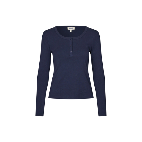 Jonia-toppen er lavet af blød, fint ribbet økologisk bomuldsjersey for en behagelig pasform. Det er en langærmet top med rund halsudskæring og tre knapper foran.