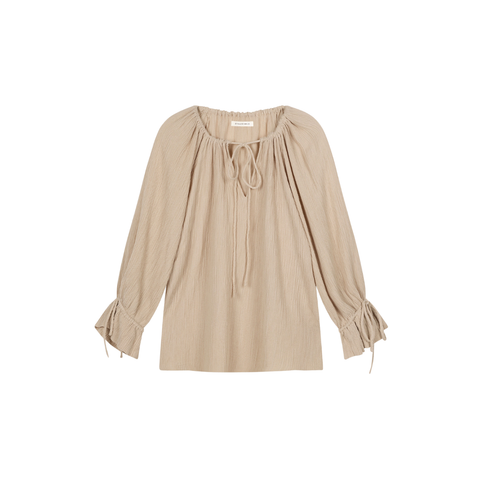Rose Weave-blusen har et eklektisk og elegant udtryk, der gør den nem at have på og let at style. Designet med krave, dyb V-hals og justerbare bindebånd giver blusen et feminint og fleksibelt look, som kan tilpasses forskellige anledninger og årstider.