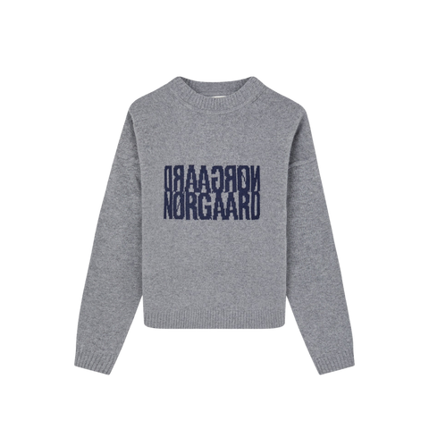 Loose uld striktrøje med hængende skuldre, lange ærmer, brede ribstrikkede kanter og delvist spejlvendt ikonisk logo strikket på brystet.