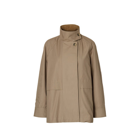 Denne jakke har en høj hals og lange raglanærmer med knapmanchetter, som giver et elegant og stilfuldt udtryk. Den skjulte knaplukning fremhæver det rene design, mens de praktiske forlommer tilføjer funktionalitet. Jakken er foret med blødt bomuld, hvilket sikrer en behagelig og åndbar følelse hele dagen. Med fokus på bæredygtighed er den fremstillet med mindst 50% økologisk bomuld, hvilket gør den til et miljøvenligt valg. Jakken er perfekt til formelle lejligheder i forårssæsonen og kombinerer kvalitet med et klassisk, tidløst look.